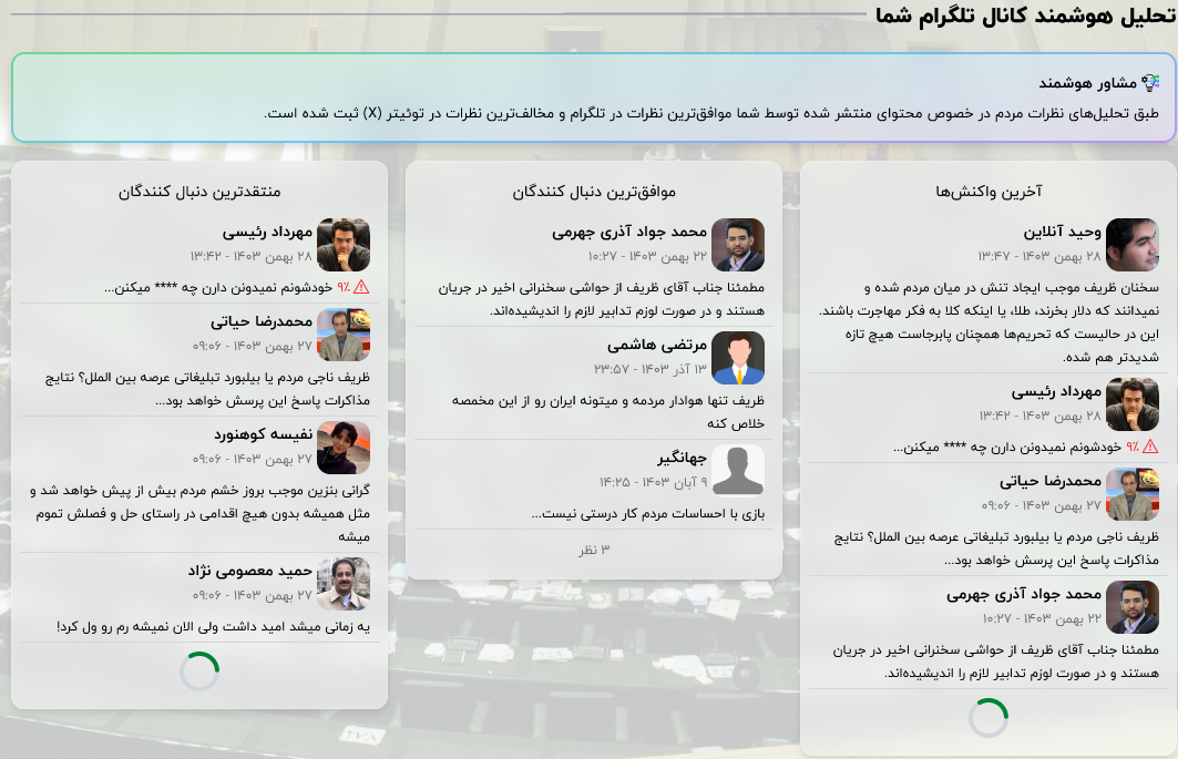 تحلیل دقیق محتوای منتشرشده در کانال تلگرامی شما همراه با پیشنهادهای مشاوره هوشمند.